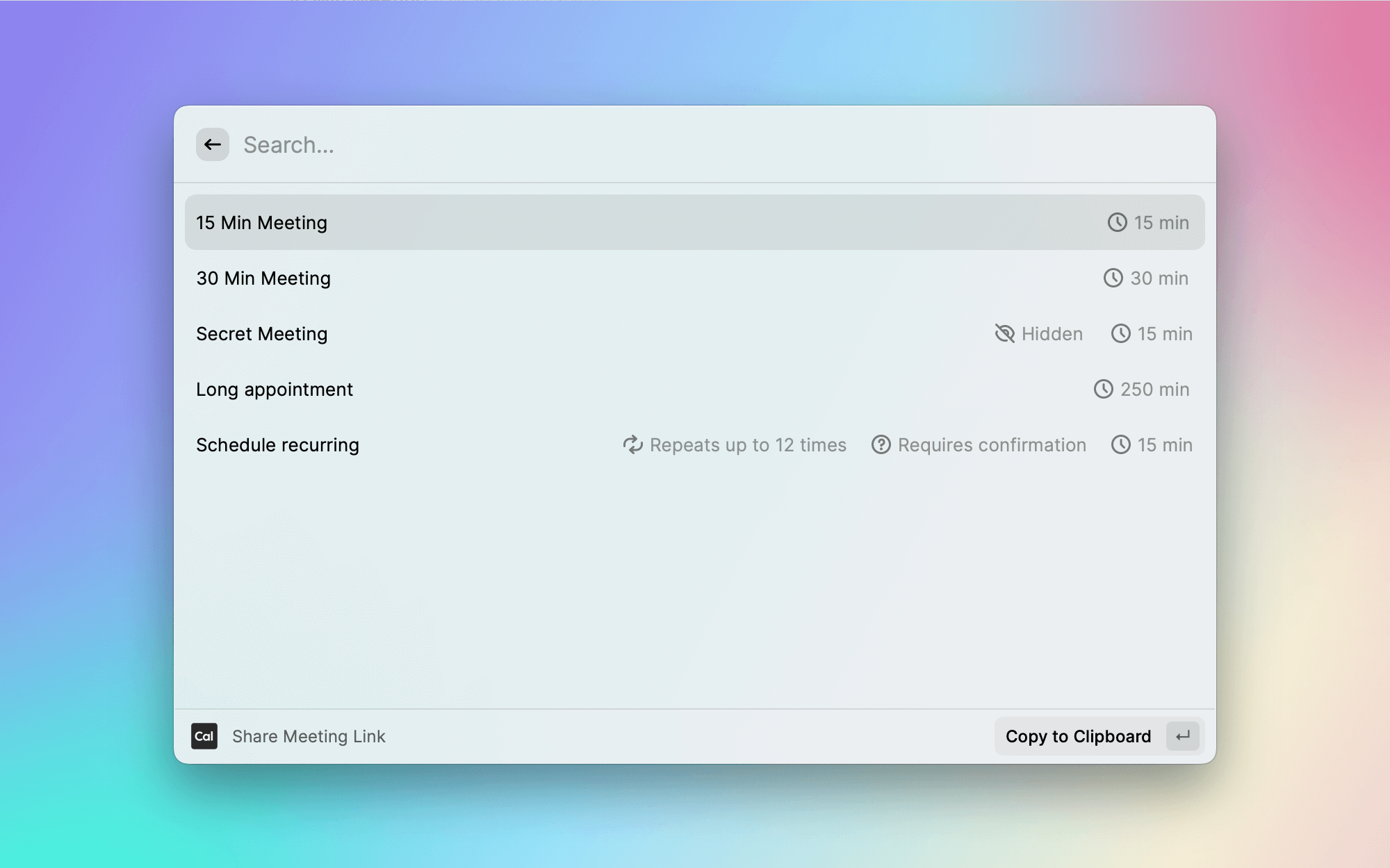 Quickly share your Cal.com meeting links with Raycast. Requires Raycast.com to be installed and the Cal.com from the Raycast Store needs to be installed: https://www.raycast.com/cal/. You can create an API token in your Developer Cal.com Settings, and then you can add the API Key by opening up the Cal.com App in Raycast.